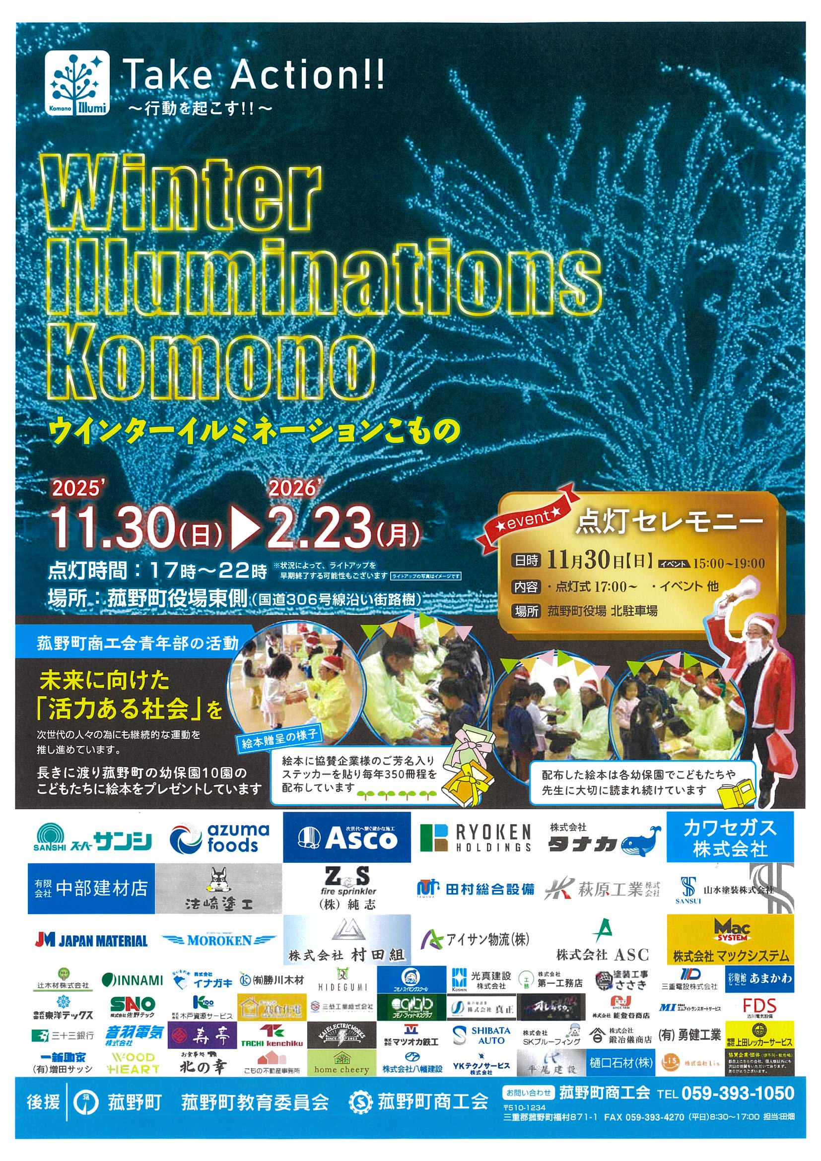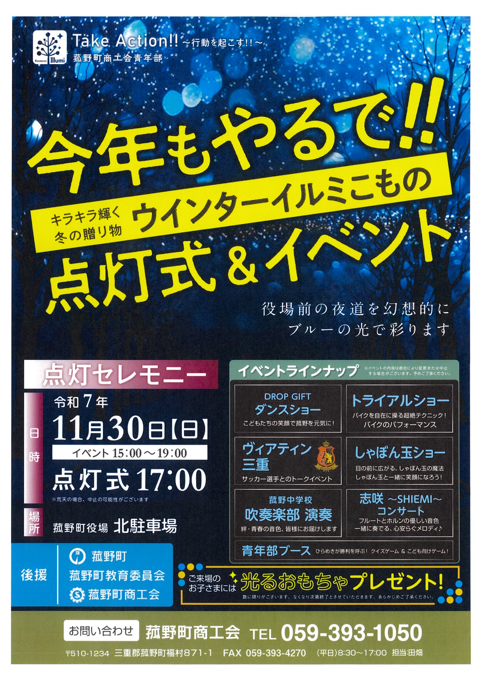※点灯式当日はセレモニーの他、ダンスショーやしゃぼん玉ショー、菰野中学校吹奏楽部の演奏などがあります。また、お子様へのプレゼントもあります。詳細はチラシをご覧ください。