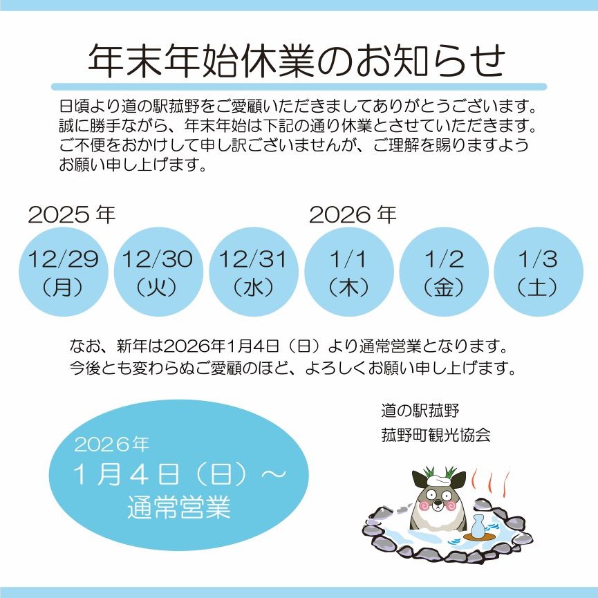 【道の駅菰野・菰野町観光協会 年末年始休業のお知らせ】
