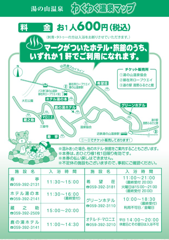 利用できる入浴施設や時間等、その他詳細は湯の山温泉協会のHPを参照ください