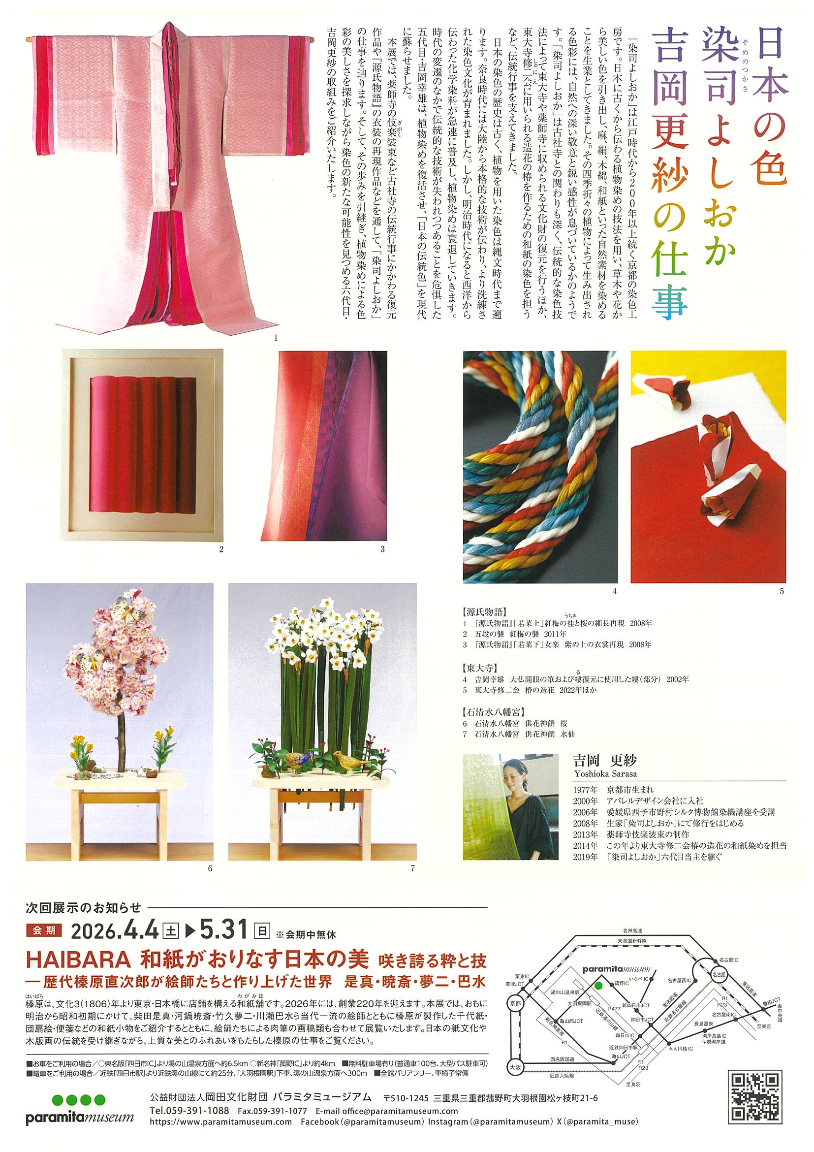 本展では、薬師寺の伎楽装束など古社寺の伝統行事にかかわる復元作品や『源氏物語』の衣装の再現作品などを通して、「染司よしおか」の仕事を辿ります。そして、その歩みを引継ぎ、植物染めによる色彩の美しさを探求しながら染色の新たな可能性を見つめる六代目・吉岡更紗の取組みをご紹介いたします。