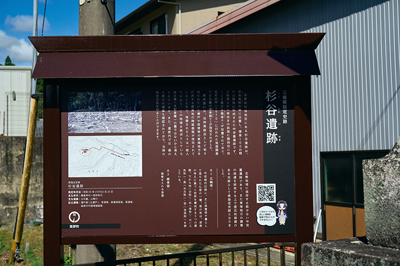 ちなみにこの看板の二次元バーコードを読むと動画で八重姫のキャラが杉谷遺跡の解説をしてくれるのだ。遺跡に向かう前に動画で事前学習するのもアリだ。最初に行った田光の湿地にも同じような看板がある。どちらも町民に地域の文化財を知って欲しいという思いで南川さんが手がけた看板だ。