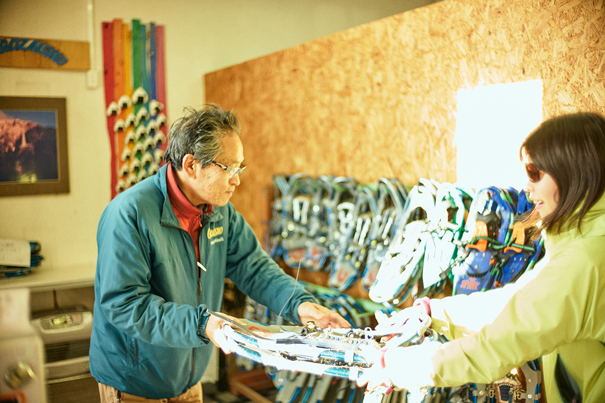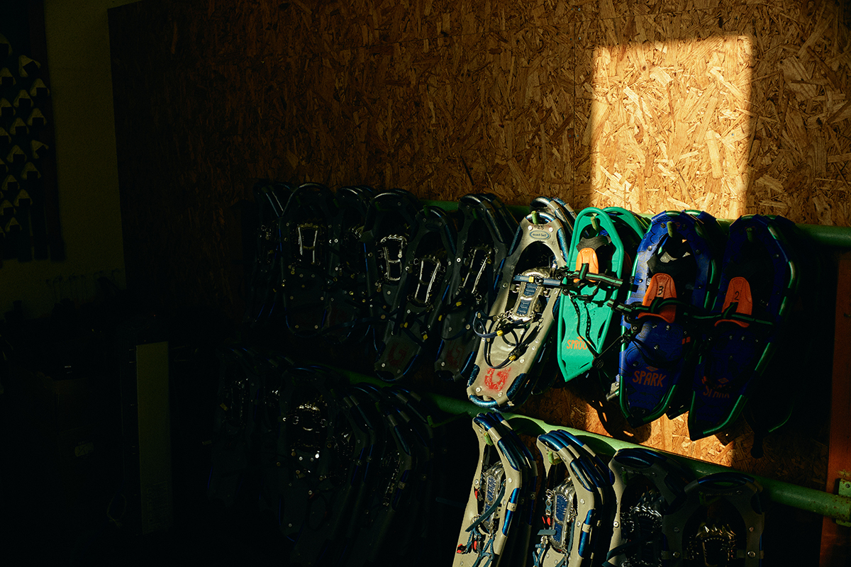 気軽にスノーシューを楽しめる理由がもうひとつある。山上のスキーハウスでスノーシューのレンタルも行っており、1000円で丸1日楽しむことができるのだ。