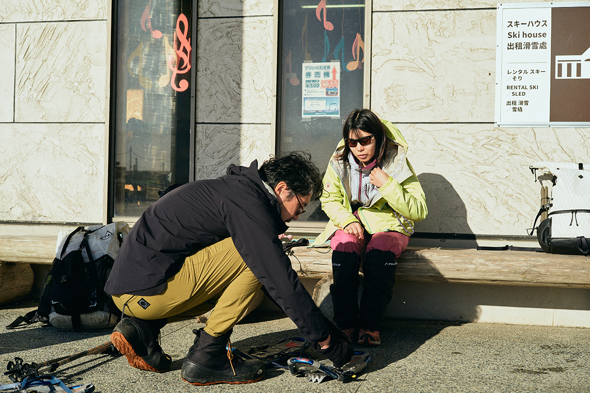 ゲイターとは写真にも写っている黒いカバーのような装備。足の甲から脛(スネ)にかけてカバーし靴の中に雪が入るの防ぐ。