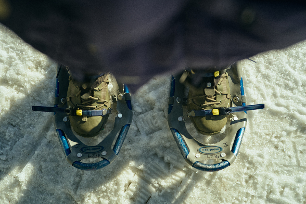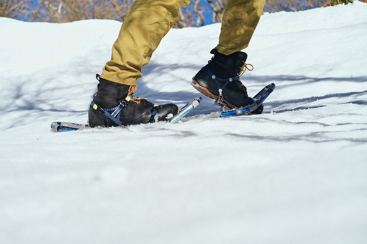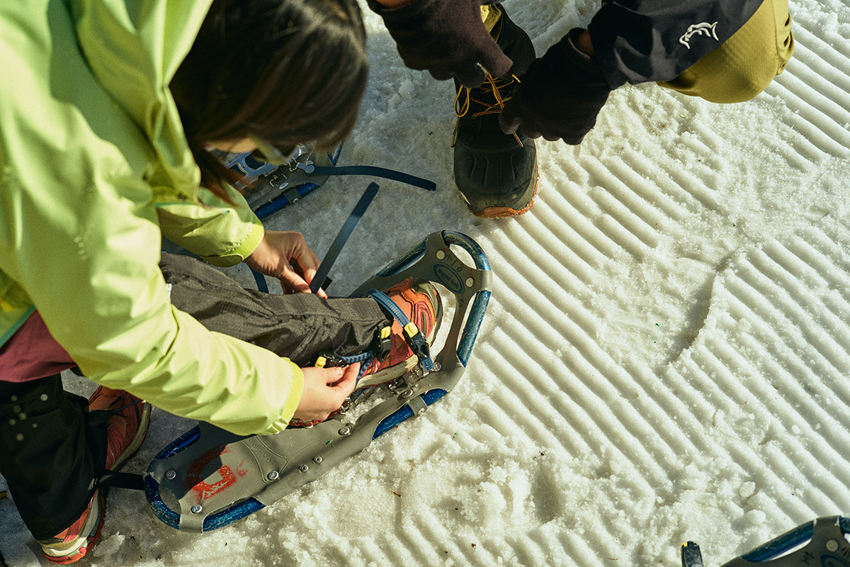 ベルトで簡単に脱着できるのでスキーより楽ちん。少し乱暴な言い方をすれば、サンダルやヒールのある靴以外ならスノーシューをつけることができる。それくらい簡単。でも雪の中を歩くので靴は防水の登山靴やスノーブーツがおすすめだ。あとゲイターもあると快適。