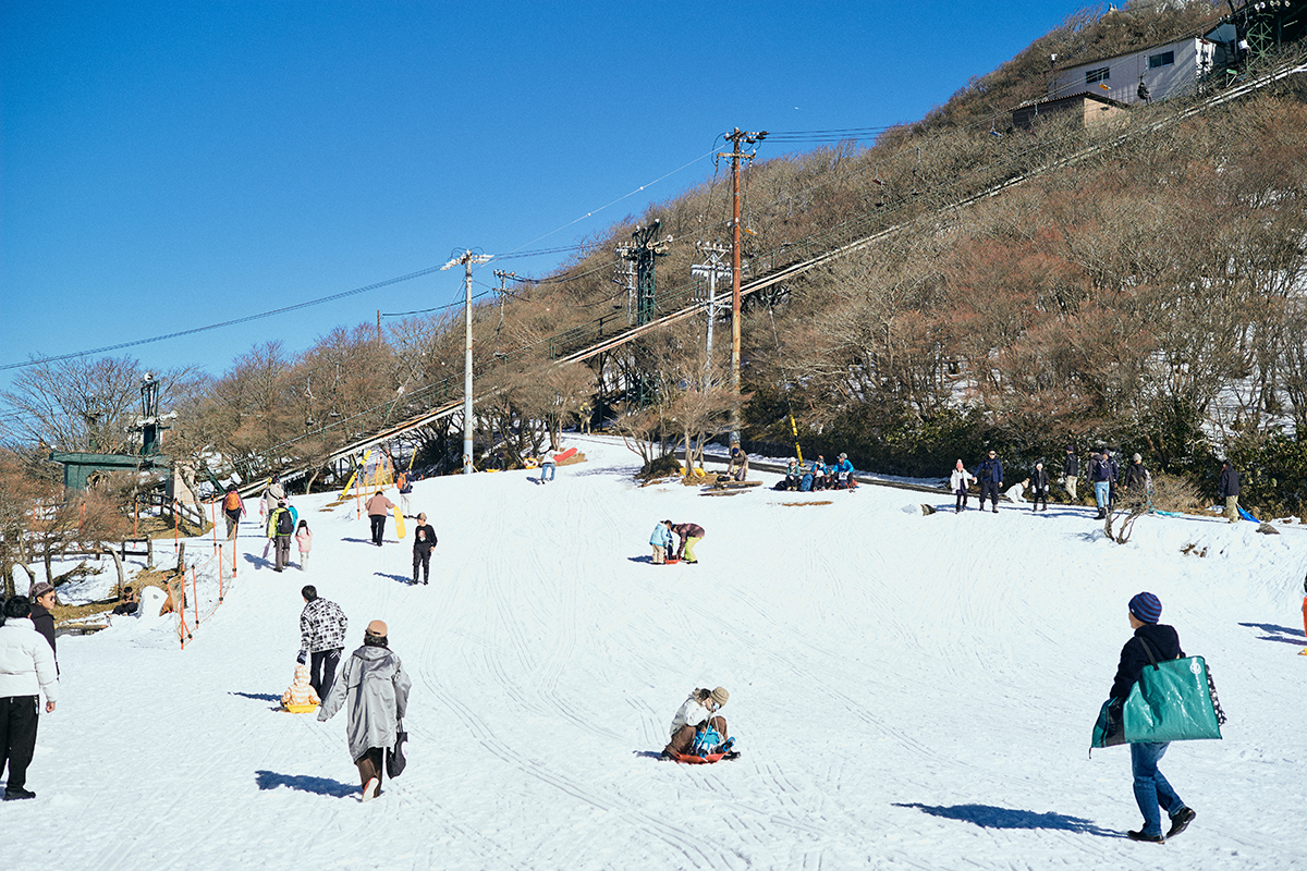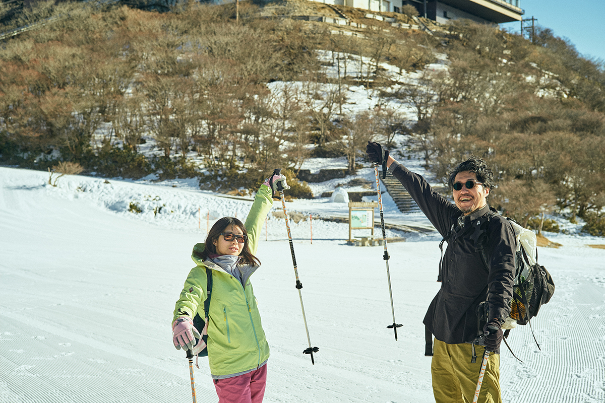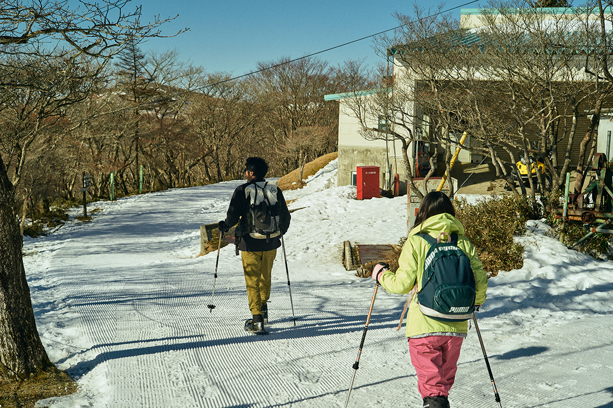 これが御在所岳の最大のメリット。通常スノーシューを楽しもうと思うと、アイゼンやピッケルなど雪山装備をして山頂を目指さないといけない。もしくは、長野県や岐阜県の標高の高いエリアまで足を伸ばさないといけないが、ロープウェイがある御在所岳は「気軽に」スノーシューなどのスノーアクティビティが楽しめるのだ。