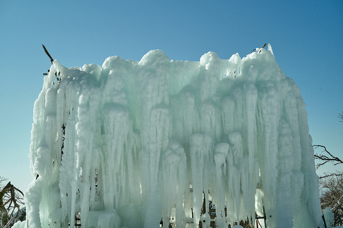 御在所ロープウエイ名物の氷瀑を横目に進んでいく。