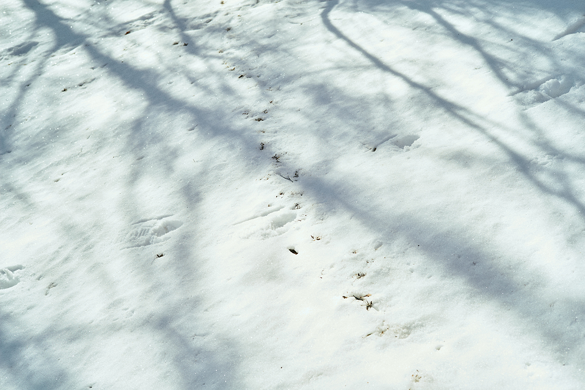 歩いていると何やら生き物の足跡らしいものを見つけた。写真ではわかりにくいが、縦に連なる跡だ。(左右に連なる跡は僕らの足跡)