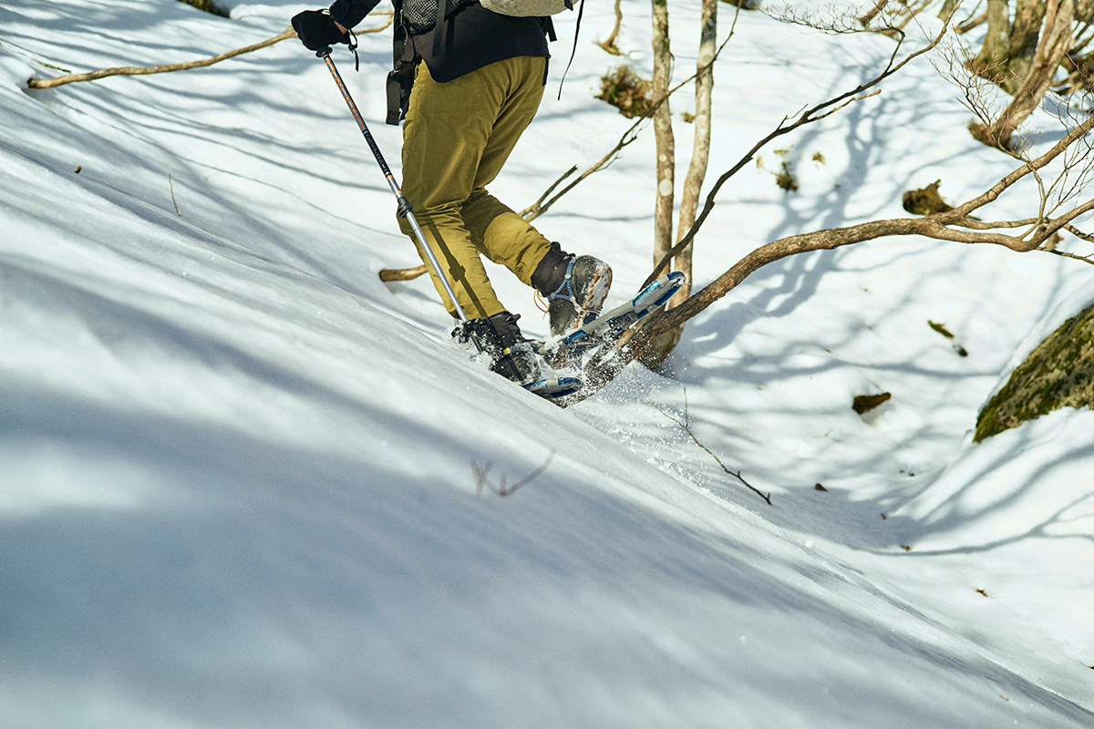 スノーシュー??という方のために説明すると、スノーシューとは現代版のカンジキみたいなものと考えてもらえればいいと思う。船のような形状が浮力となり、雪に沈まず歩くことができる道具だ。スノーシューを履くことで、スキーのような特別な技術がなくても雪深いエリアもどんどん進むことができる。
